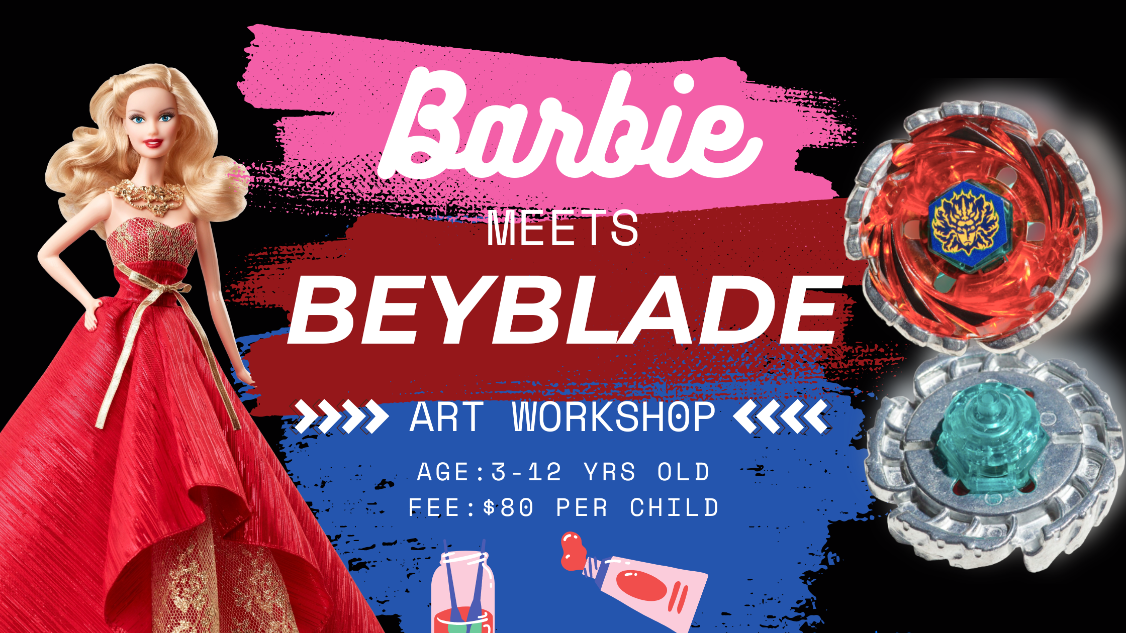 Get ready for an exciting art adventure like no other with our captivating workshop, Barbie Meets Beyblade! Don’t miss out on this unique opportunity to blend the best of Barbie and Beyblade in an artistic extravaganza!